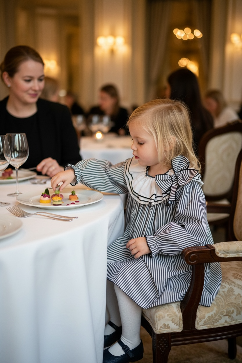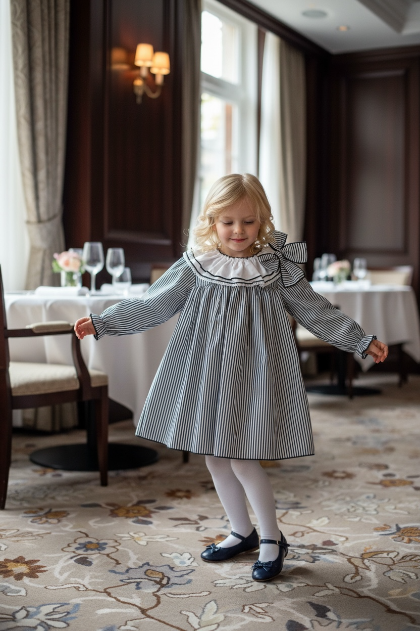 A timeless piece that brings together charm and sophistication, our Charlotte Navy Stripe Dress is designed for little girls who love to twirl and mothers who adore classic style. Crafted in a navy-and-white vertical stripe, this dress features a beautifully gathered silhouette and an elegant white double-ruffle collar trimmed with contrast navy piping and delicate lace.