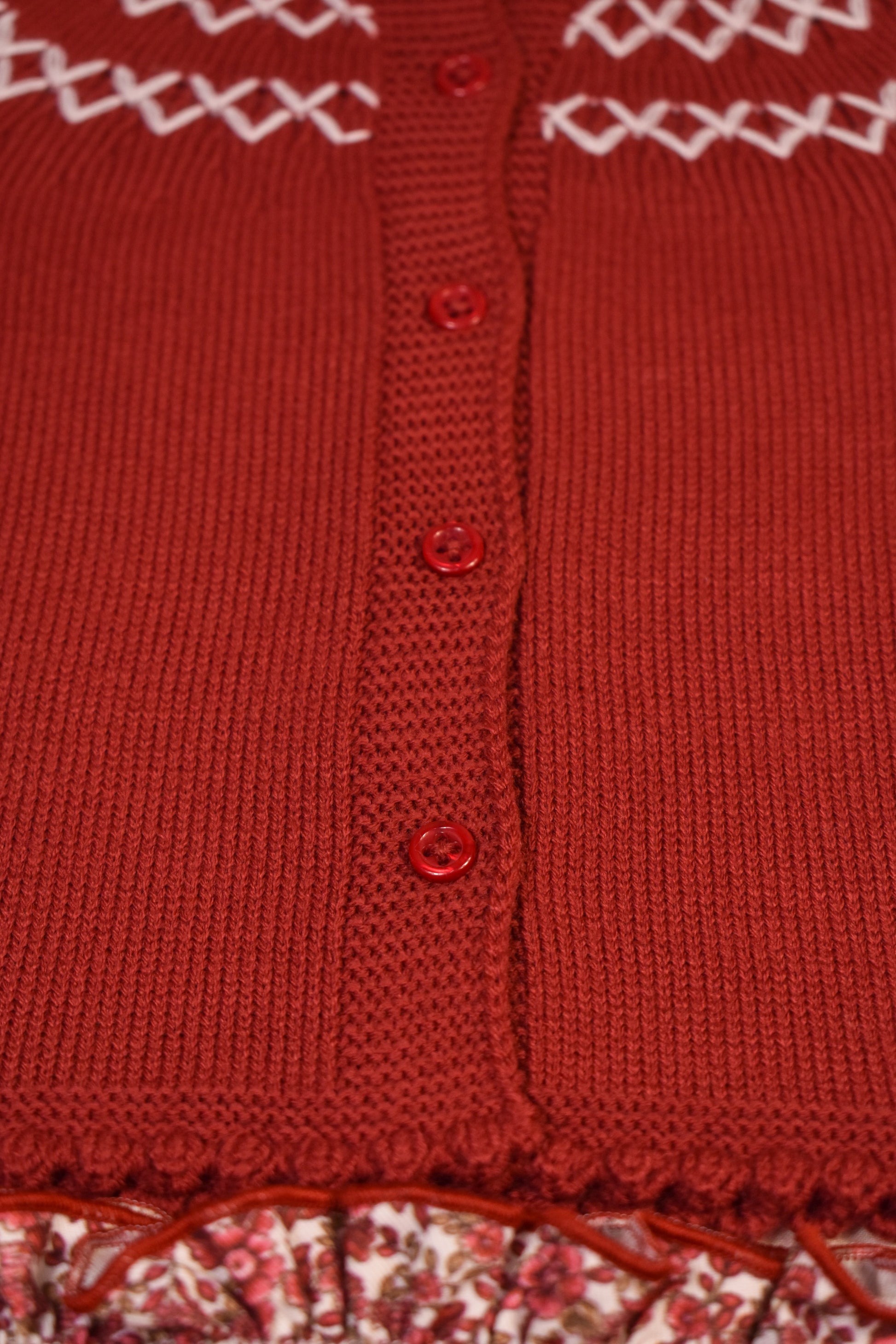 A darling little ensemble full of charm and softness. This 2-piece set pairs a beautifully knitted sweater in a rich cherry red with a sweet floral bloomer to create a classic, timeless look.