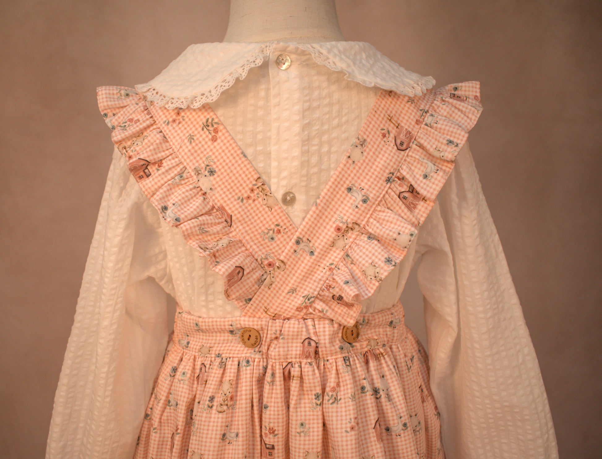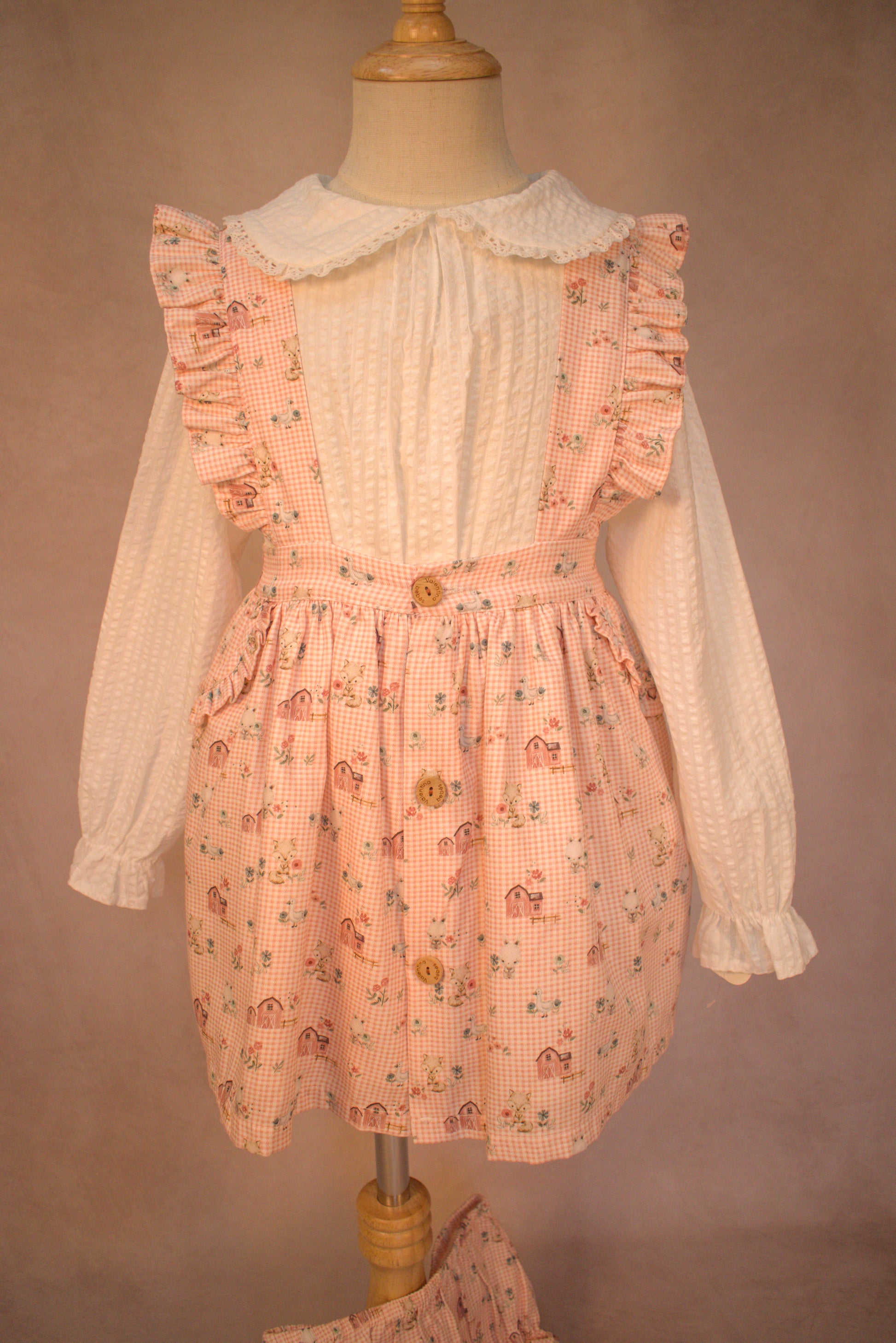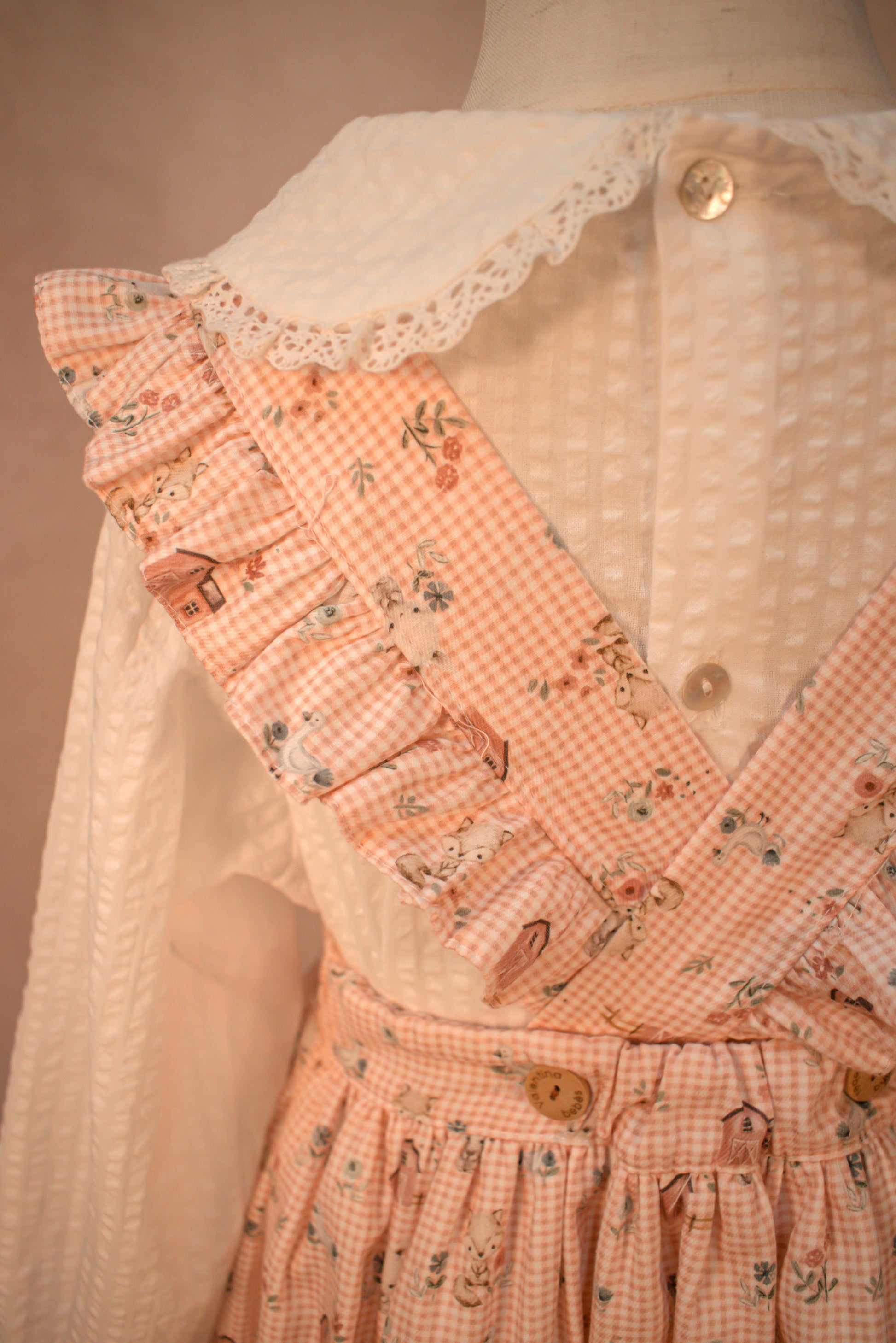 The blush gingham suspender skirt features a darling farmyard print with barns, baby animals, and tiny florals. Ruffled straps cross in the back and fasten with wooden buttons for that nostalgic European flair.