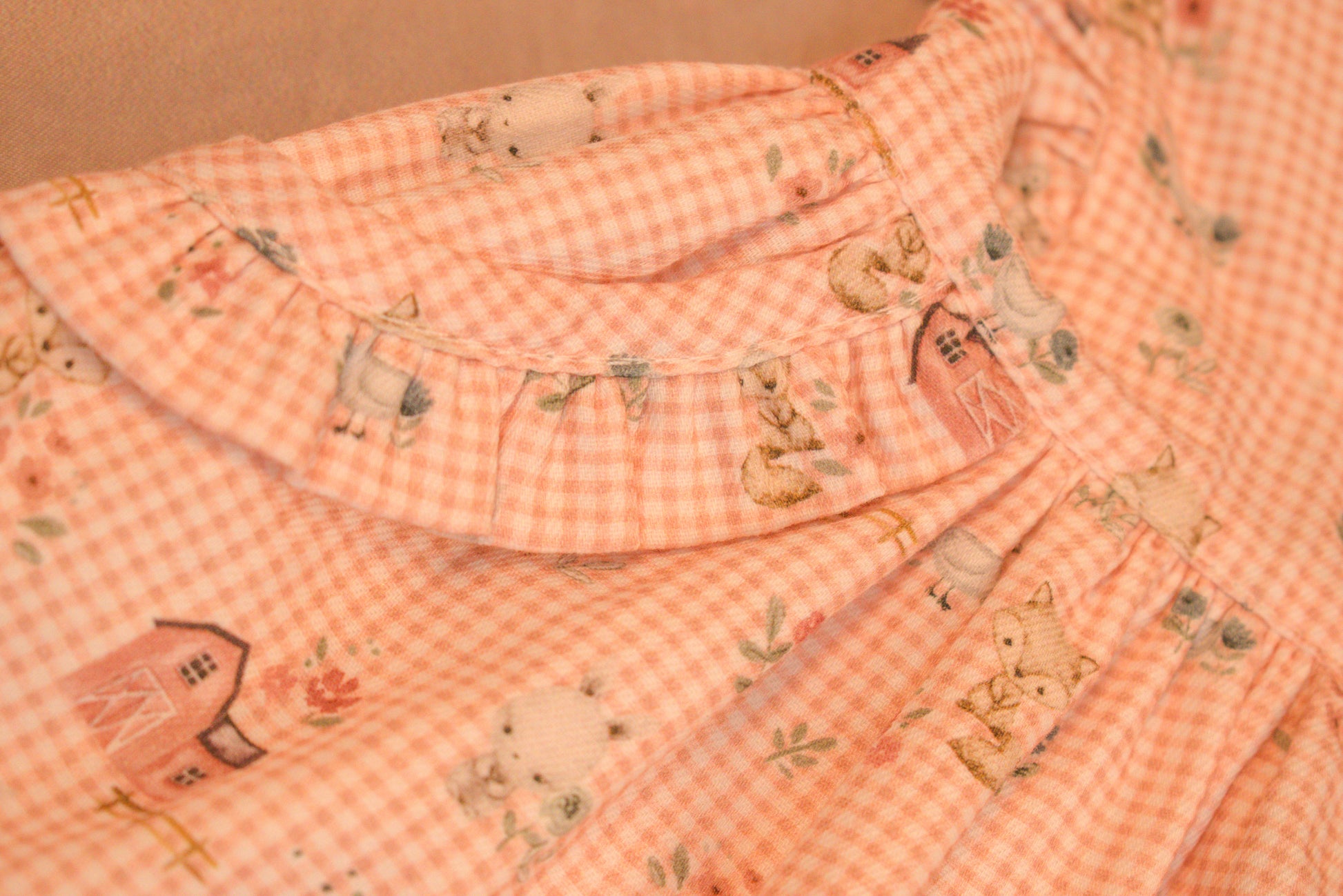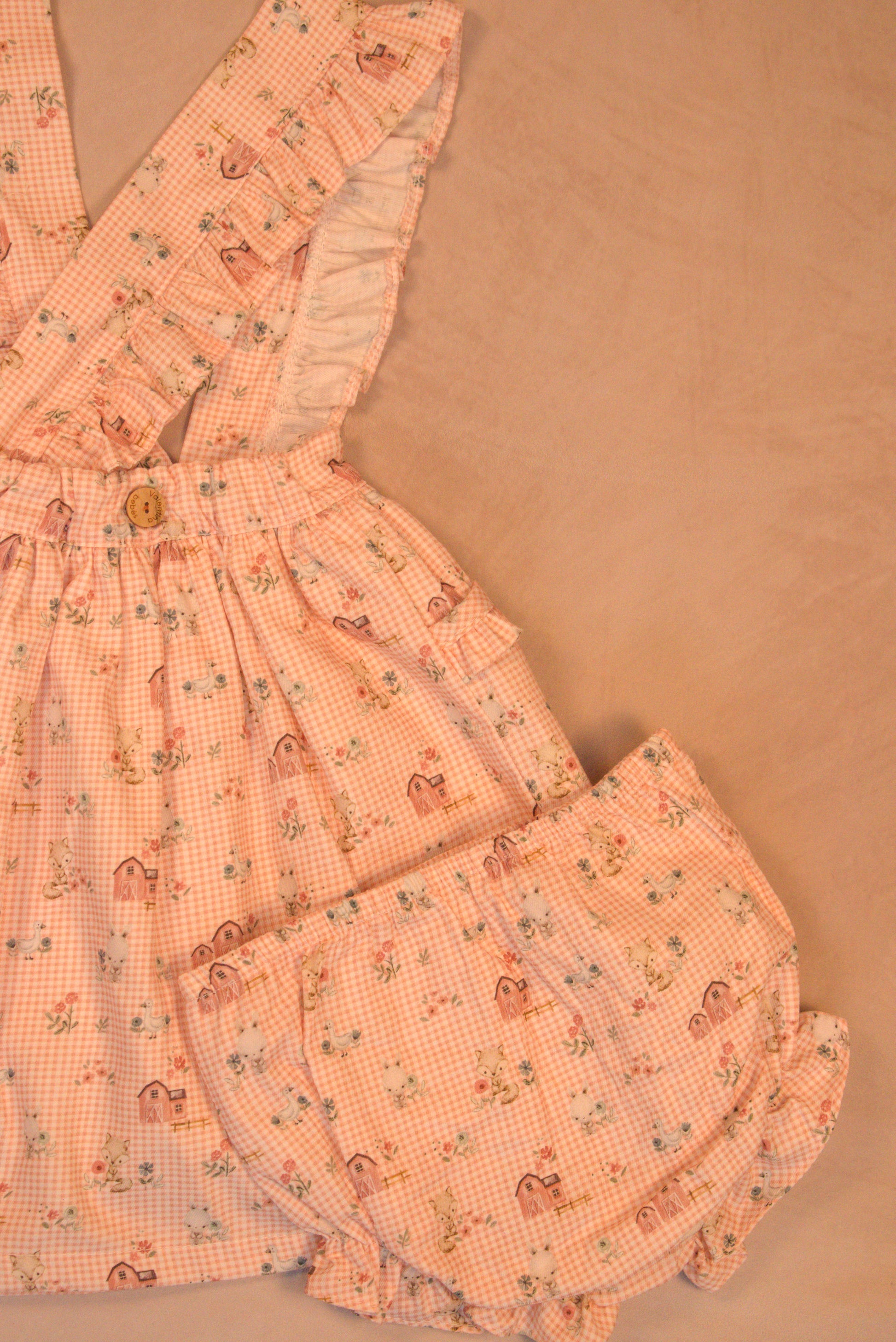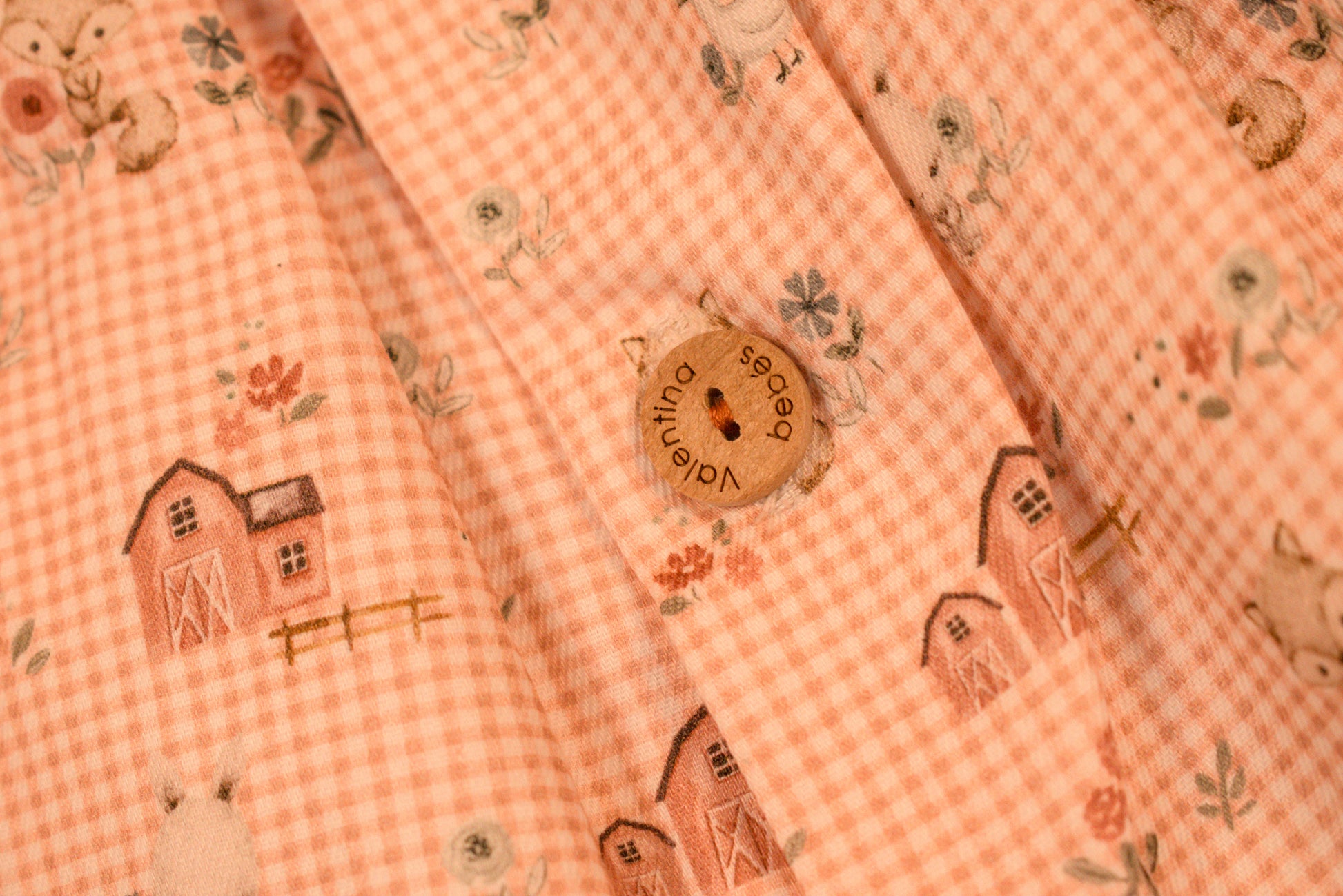 The blush gingham suspender skirt features a darling farmyard print with barns, baby animals, and tiny florals. Ruffled straps cross in the back and fasten with wooden buttons for that nostalgic European flair.