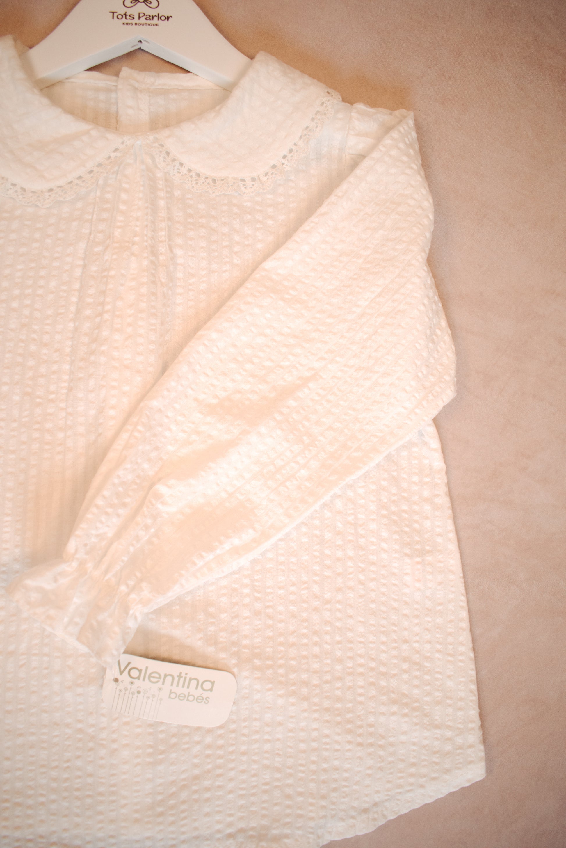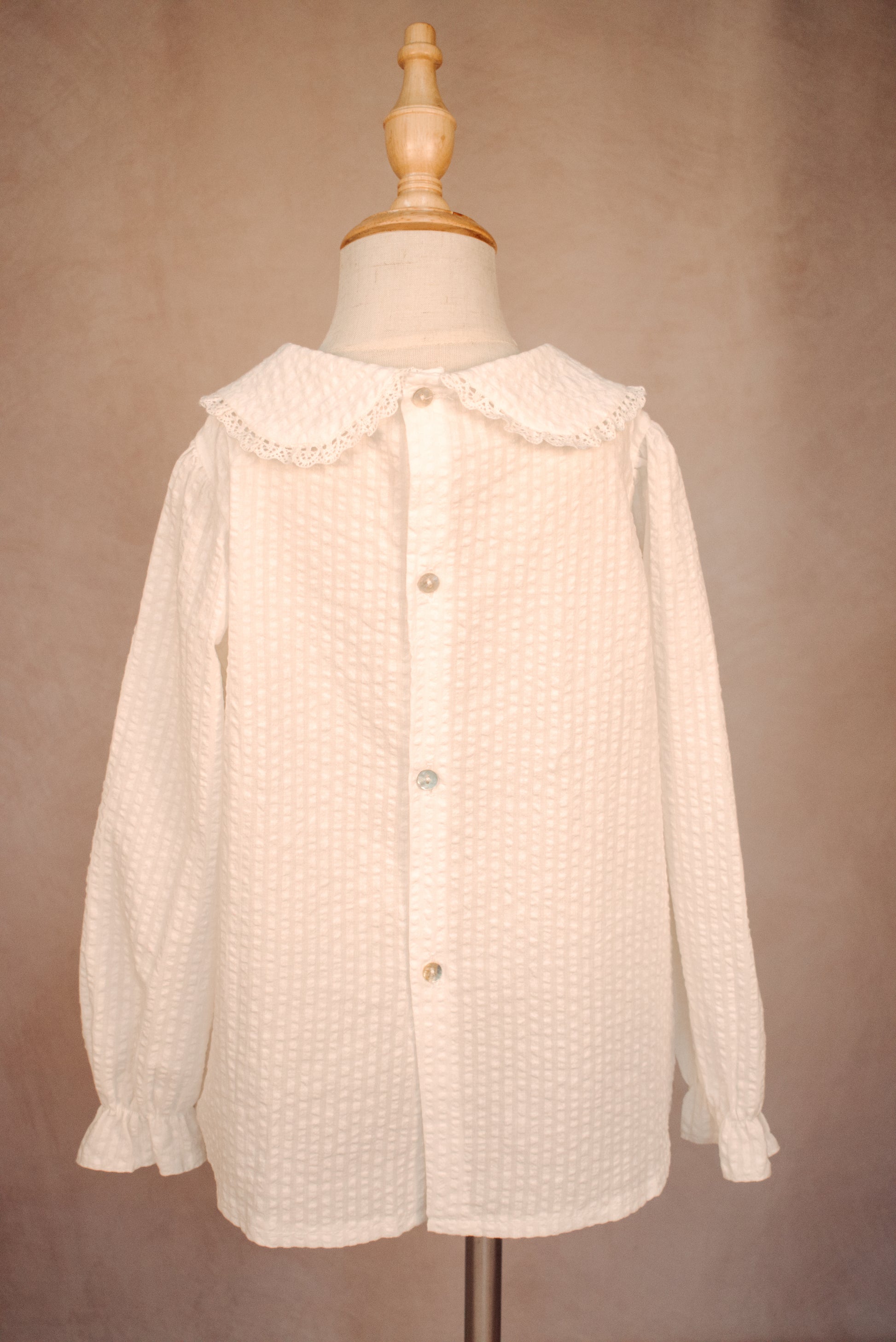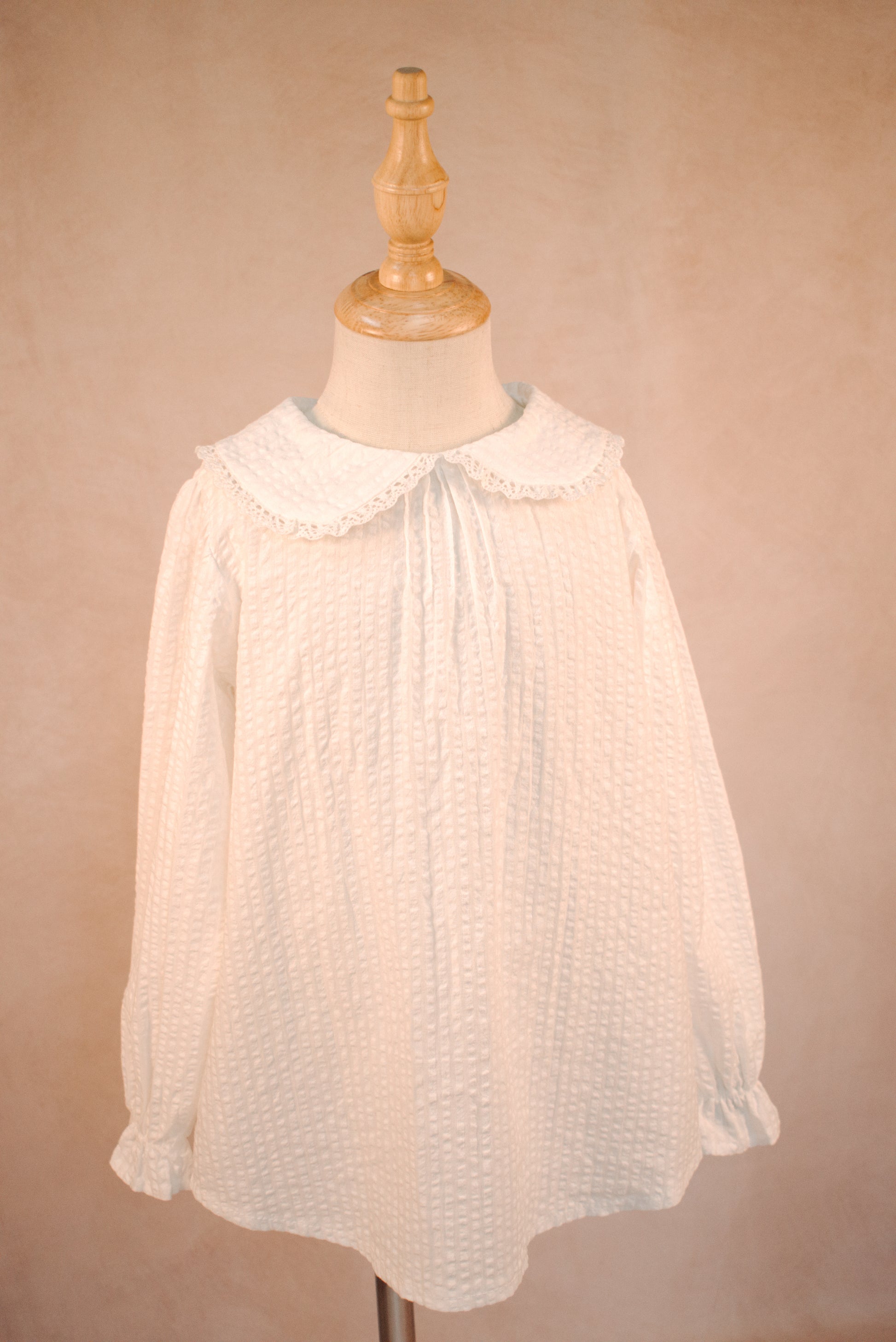 A coordinating bloomer completes the look for sizes that require coverage. Paired underneath is a stunning white blouse with a textured cotton finish, gathered sleeves, and a scalloped lace-trimmed Peter Pan collar. Fully buttoned in the back and completely removable, it allows for versatile styling year-round.