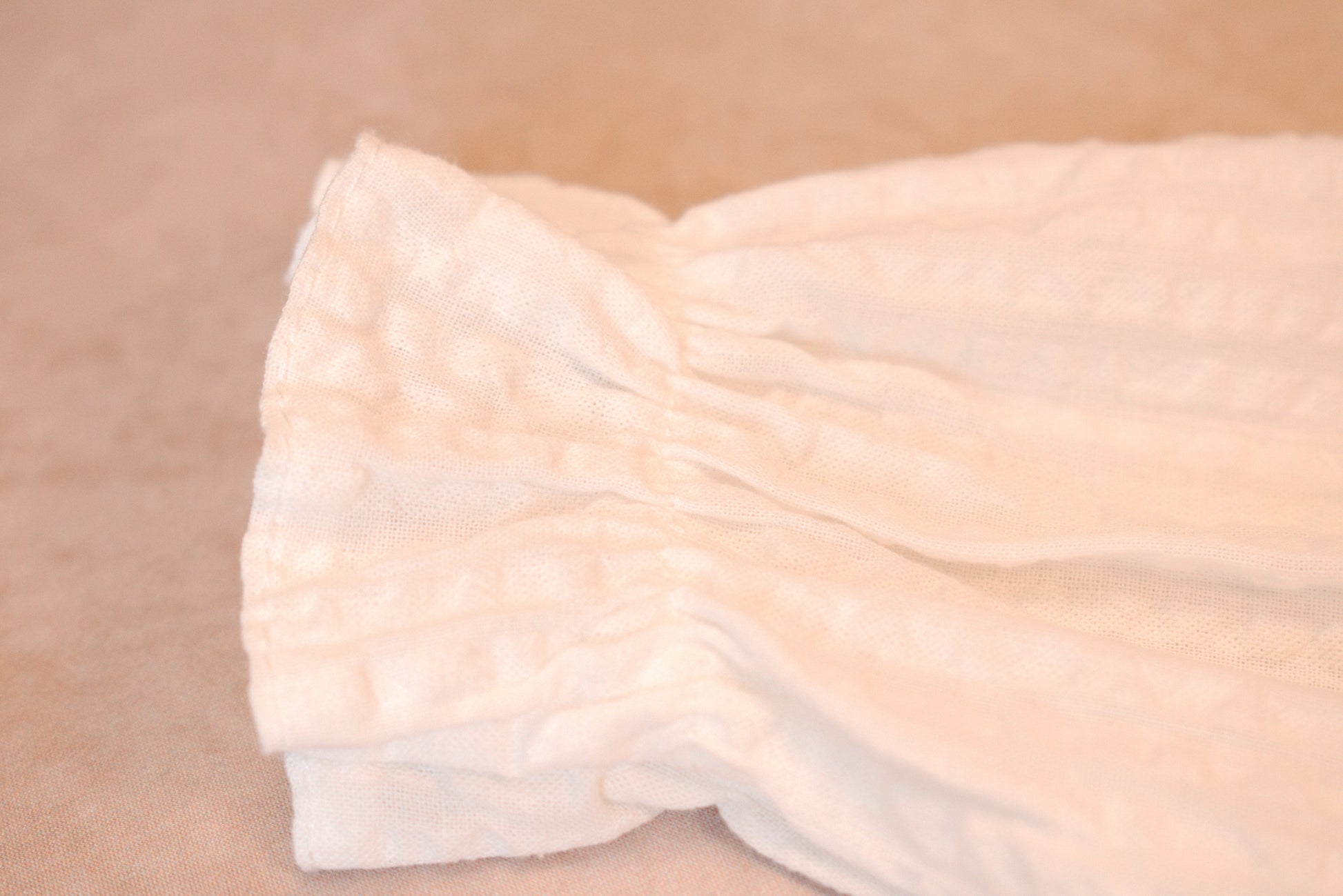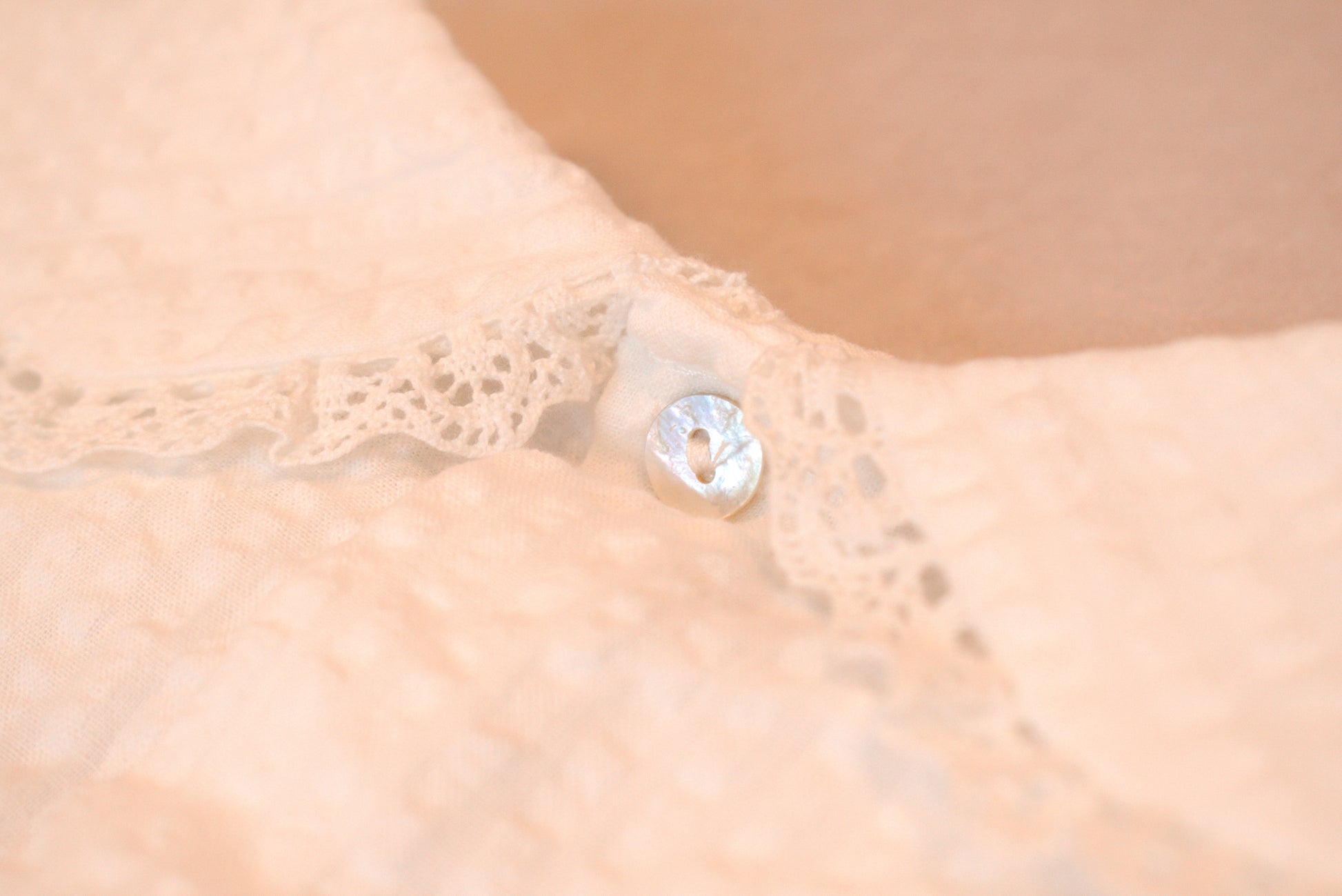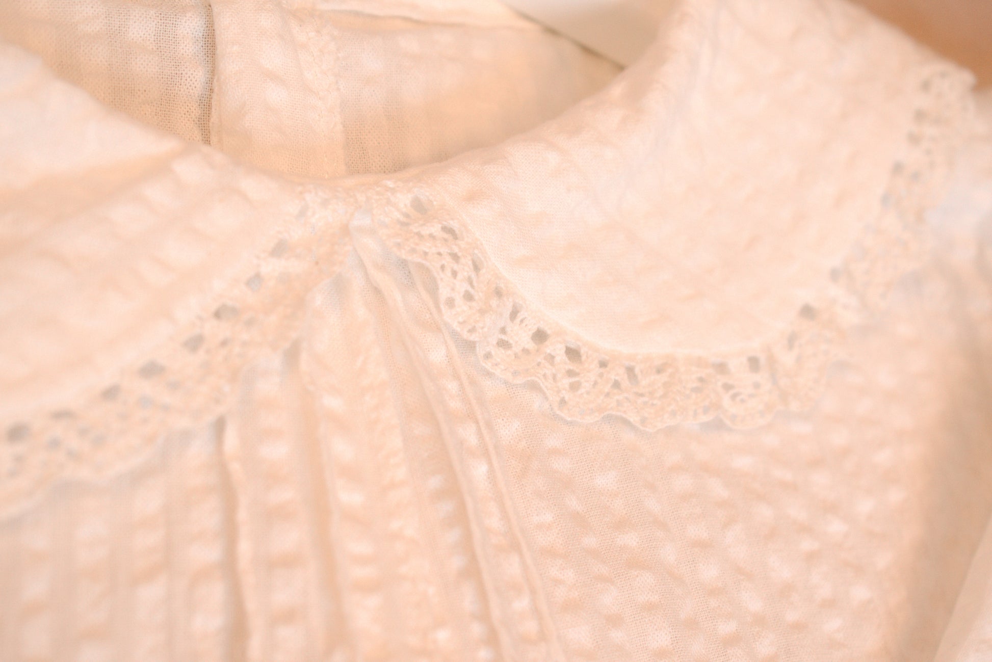 A coordinating bloomer completes the look for sizes that require coverage. Paired underneath is a stunning white blouse with a textured cotton finish, gathered sleeves, and a scalloped lace-trimmed Peter Pan collar. Fully buttoned in the back and completely removable, it allows for versatile styling year-round.