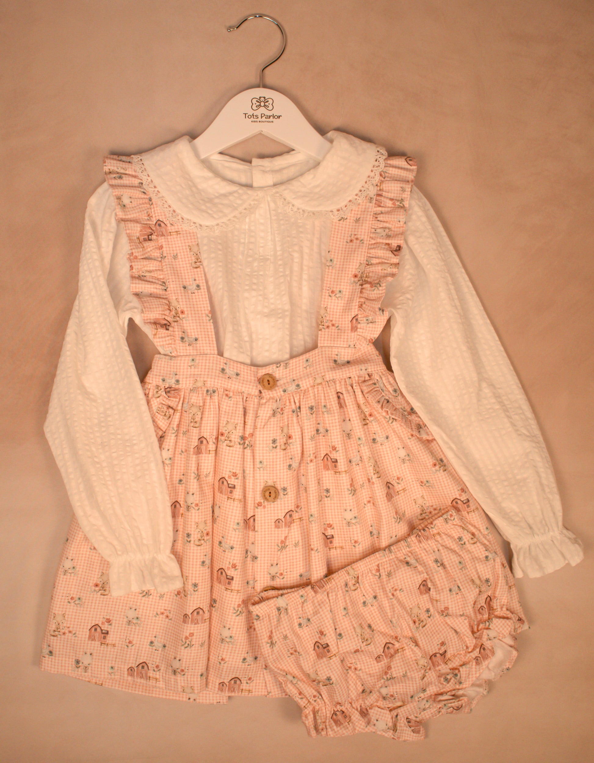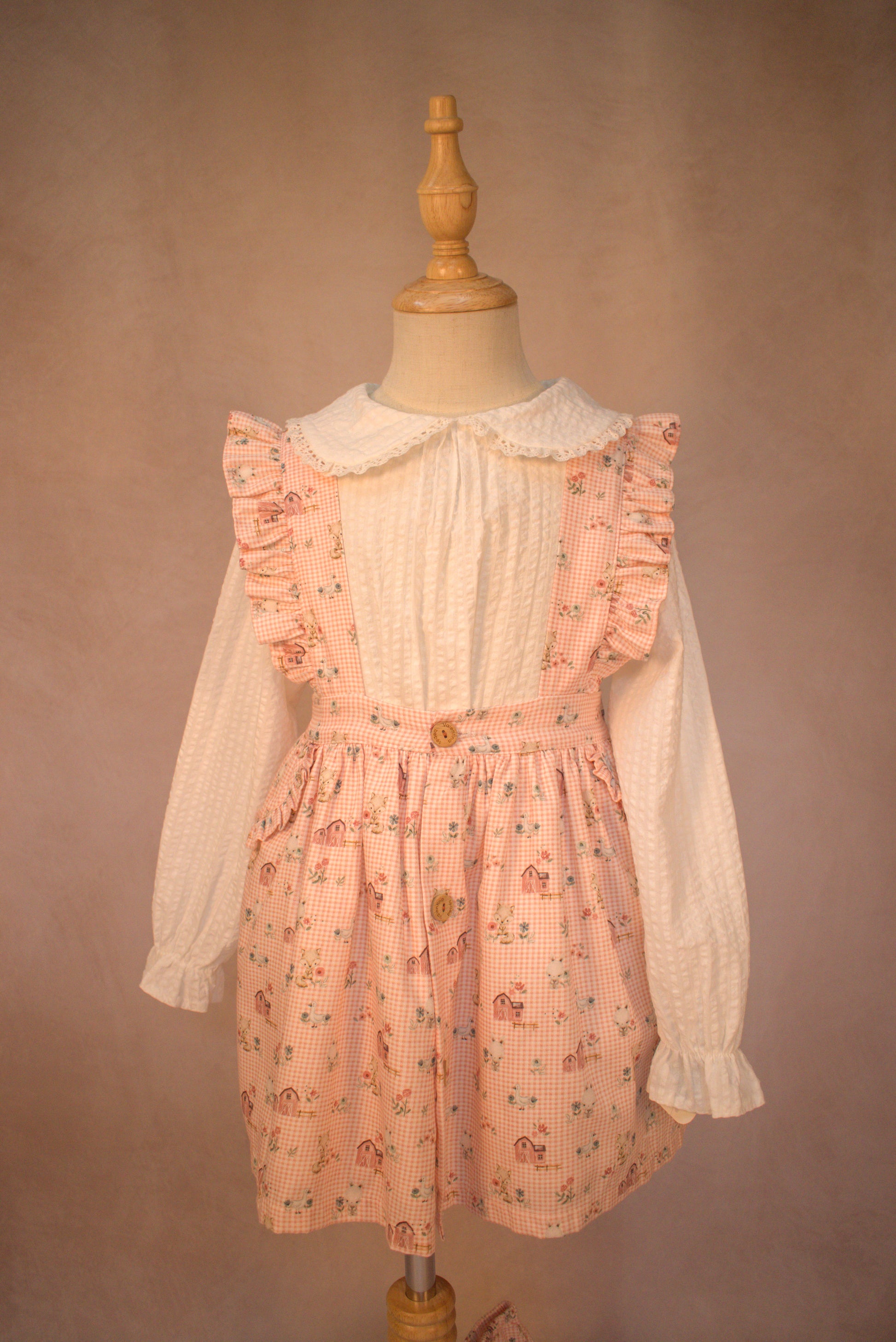 A countryside storybook look brought to life. This limited-edition 3-piece set includes a suspender skirt, matching bloomers, and a delicate white blouse, all thoughtfully designed for charm and comfort.