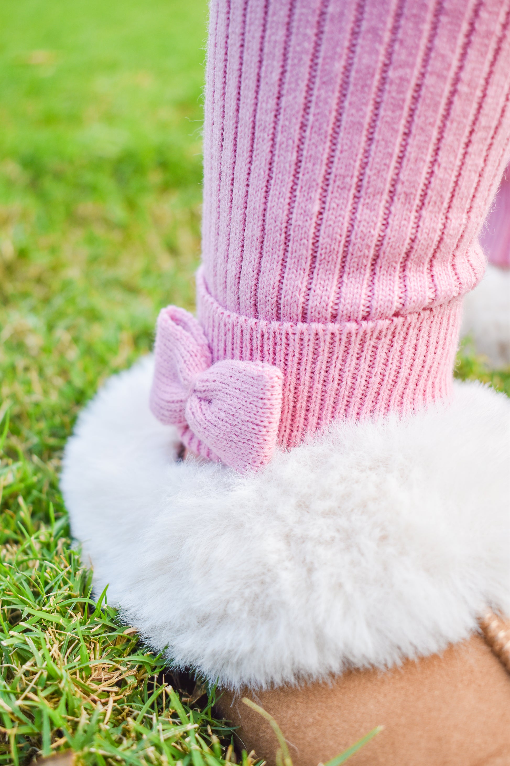This two-piece set includes a soft ribbed tunic top with a delicate ruffled collar and matching knit leggings featuring charming bow details at the cuffs.