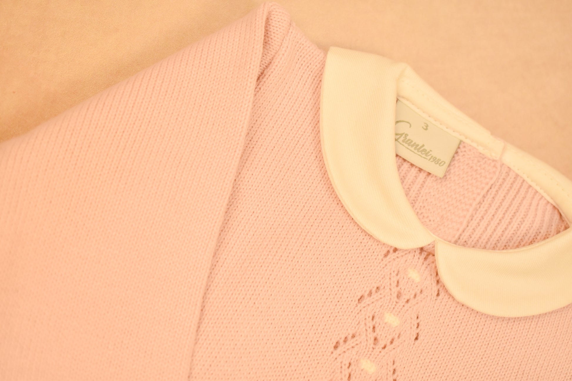 This beautifully knit romper features an elegant Peter Pan collar and delicate open-work detailing down the front, finished with a pearly button and tiny knit bows on the feet. Designed for comfort and charm, it fastens easily along the back and legs for quick changes.
