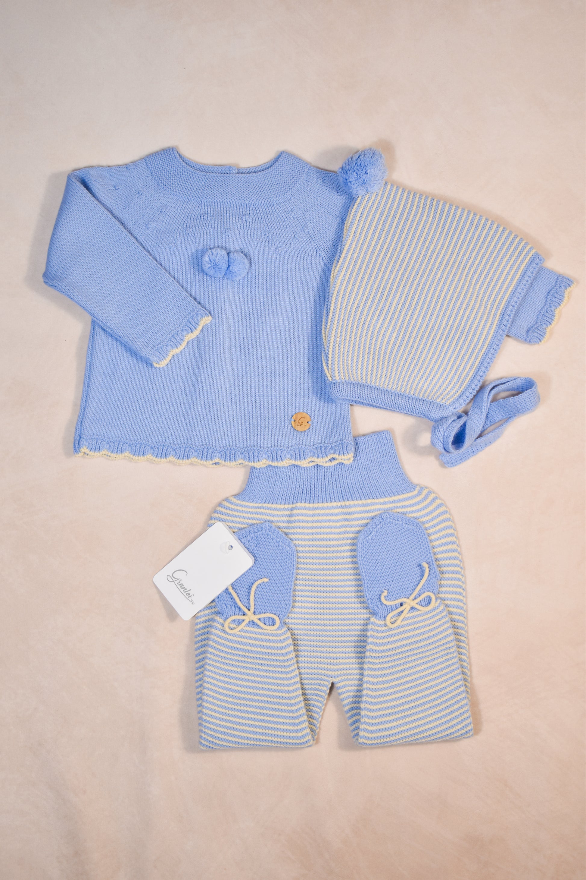 A soft and timeless winter essential for your little one. This beautifully knitted 3-piece set includes the sweater, full-length footie pants, and matching bonnet. Designed to keep baby warm from head to toe with the sweetest classic details.