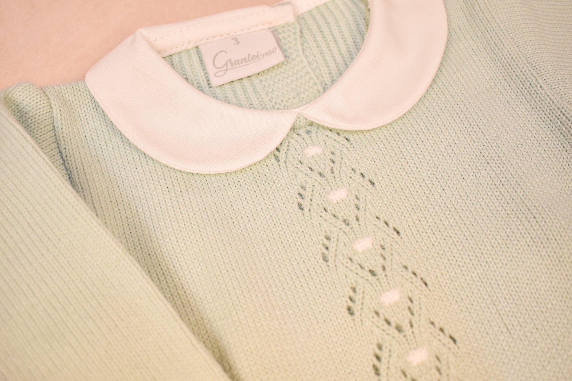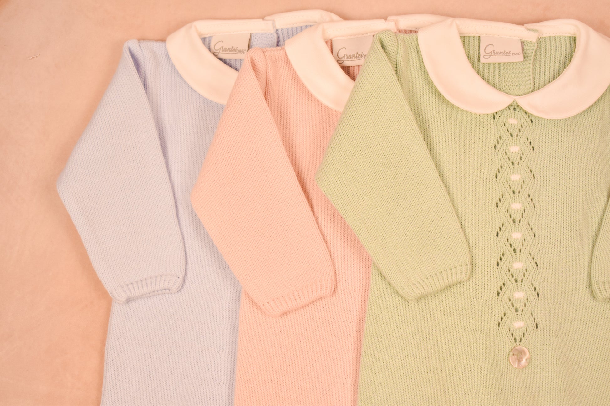 This beautifully knit romper features an elegant Peter Pan collar and delicate open-work detailing down the front, finished with a pearly button and tiny knit bows on the feet. Designed for comfort and charm, it fastens easily along the back and legs for quick changes.