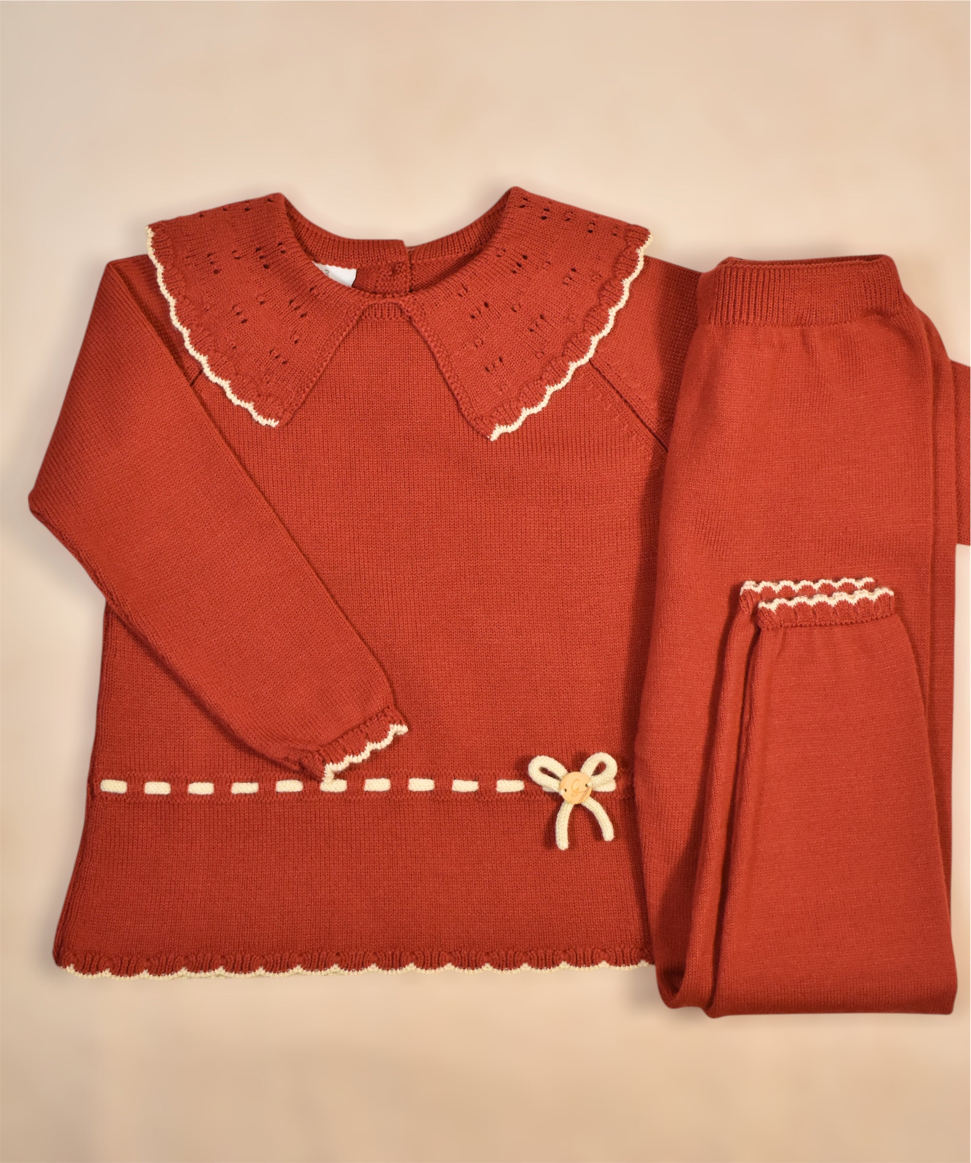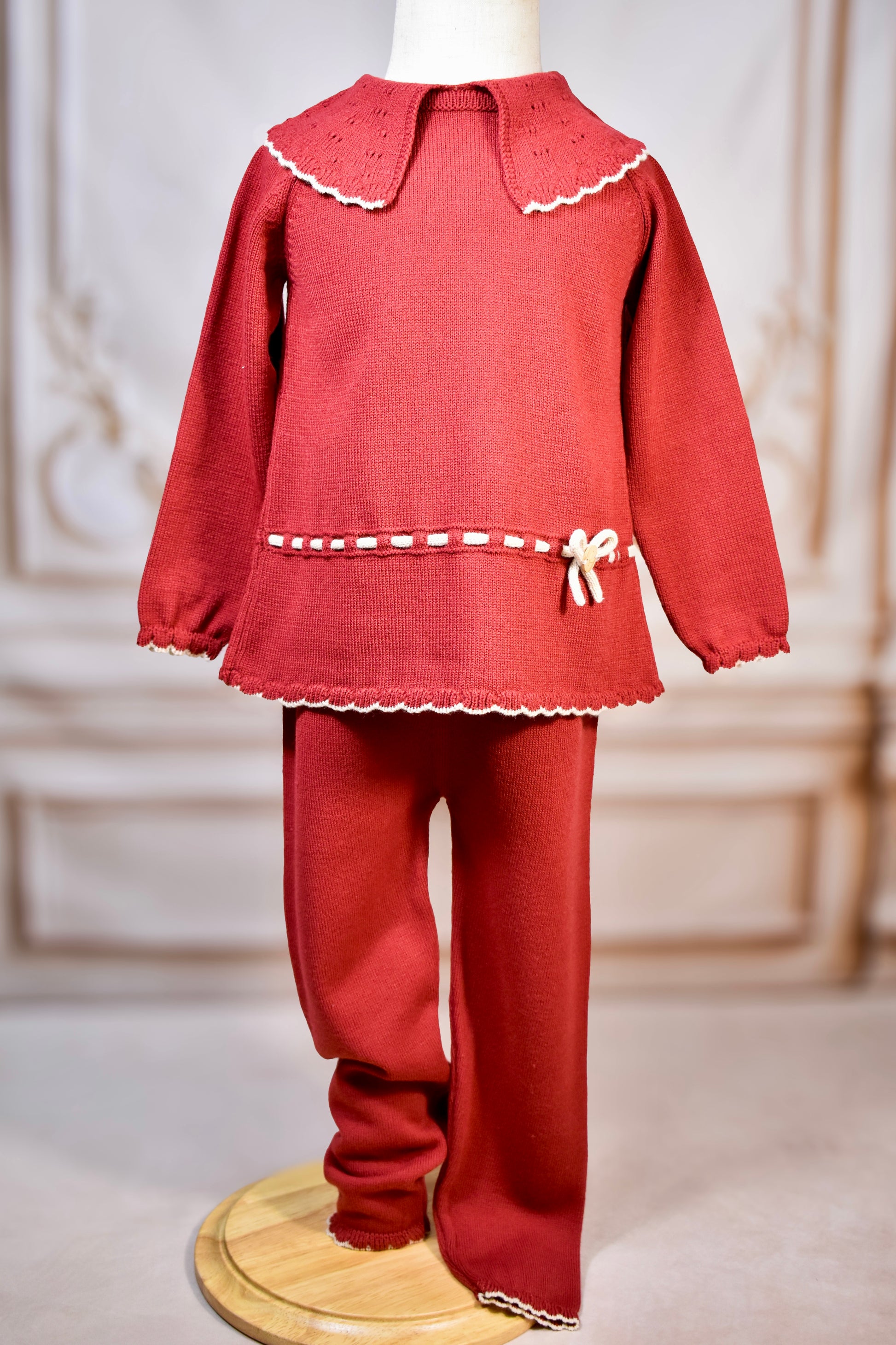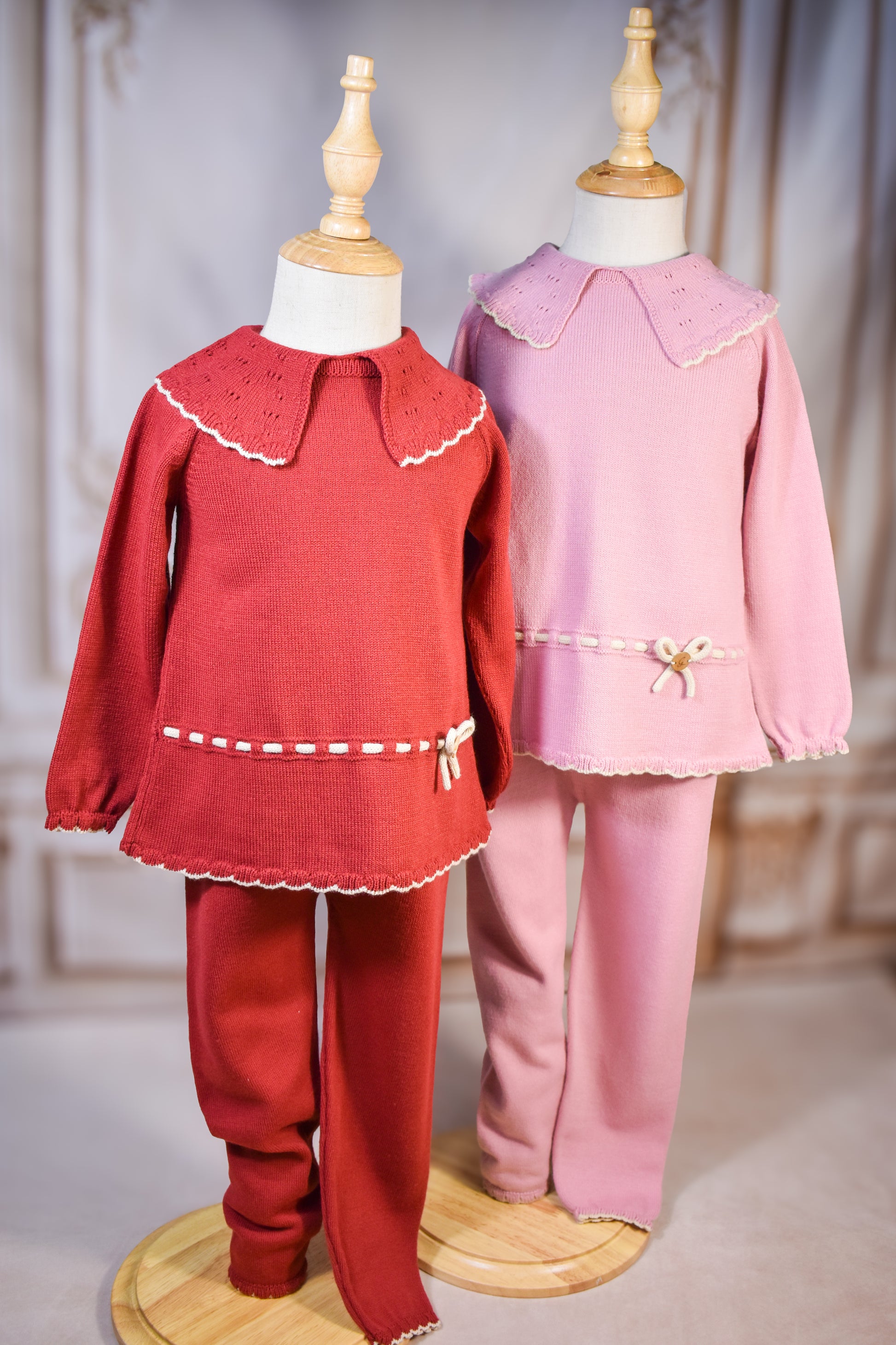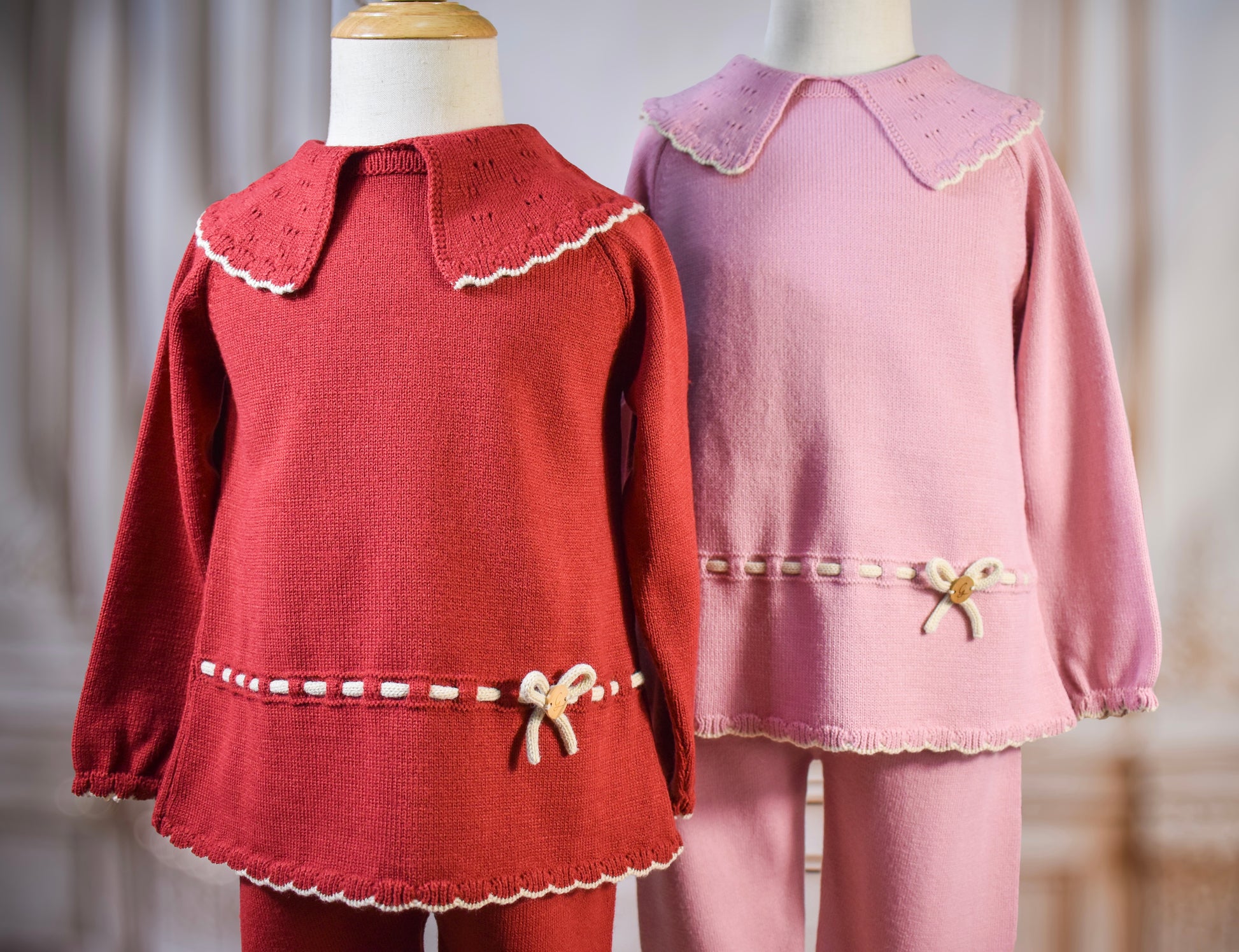 A soft little dream for cozy days and sweet outings. This two-piece knit set features a charming scalloped collar, delicate stitching details, and a tiny bow accent at the waist — those timeless touches we all love. The matching knit pants are designed with an adjustable waistband, offering comfort that grows with your little one.