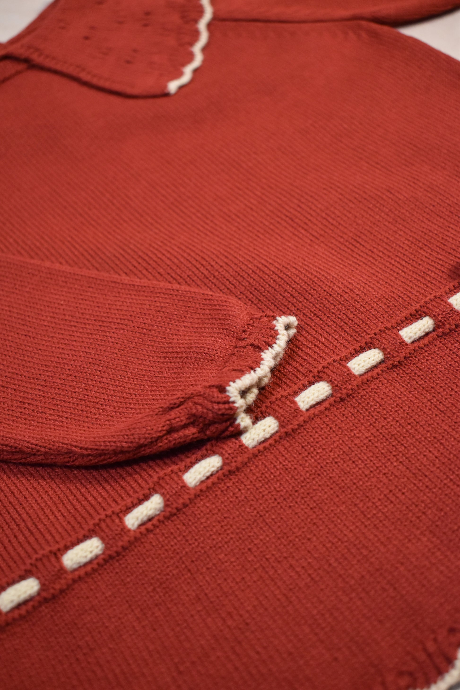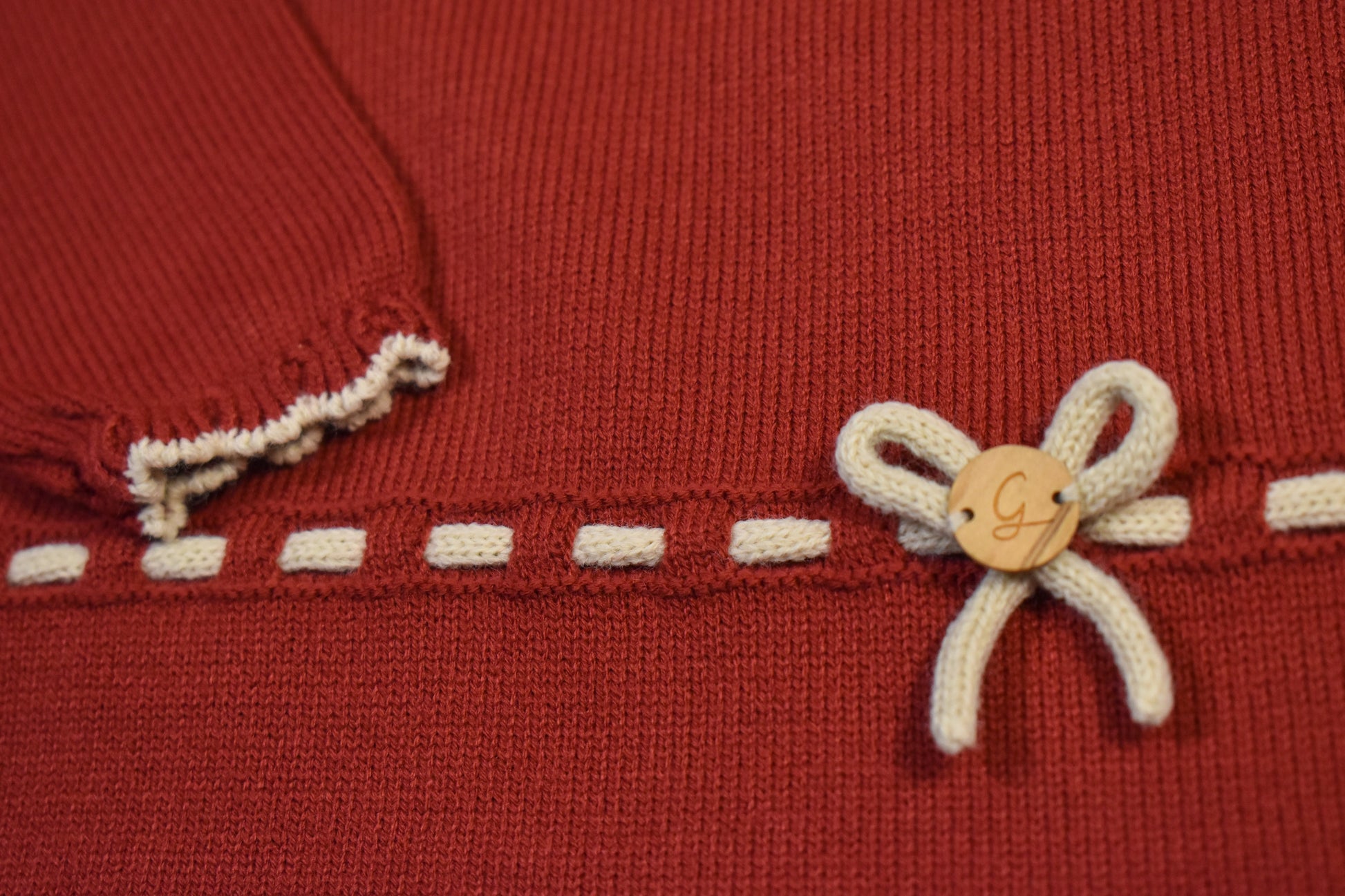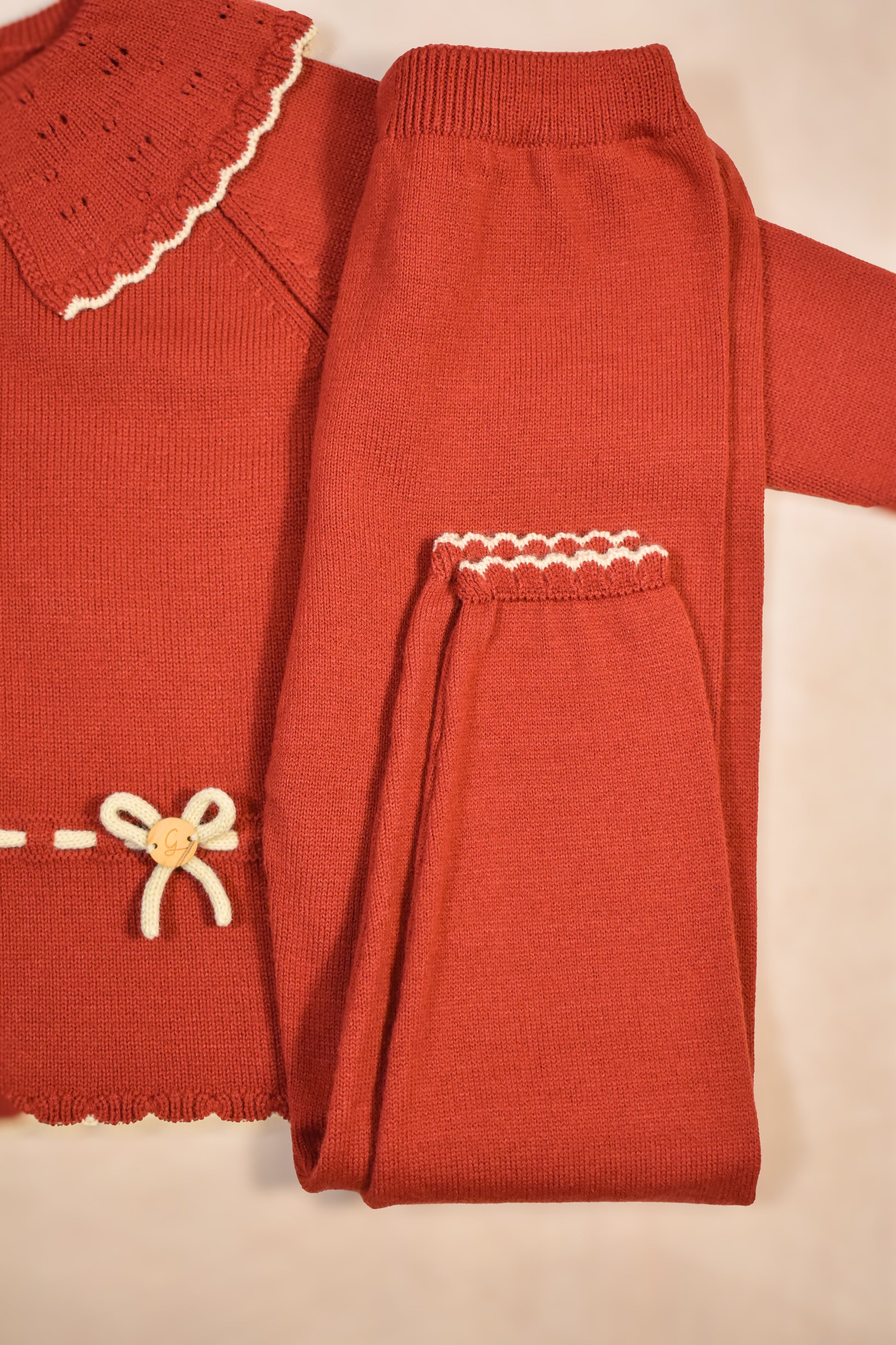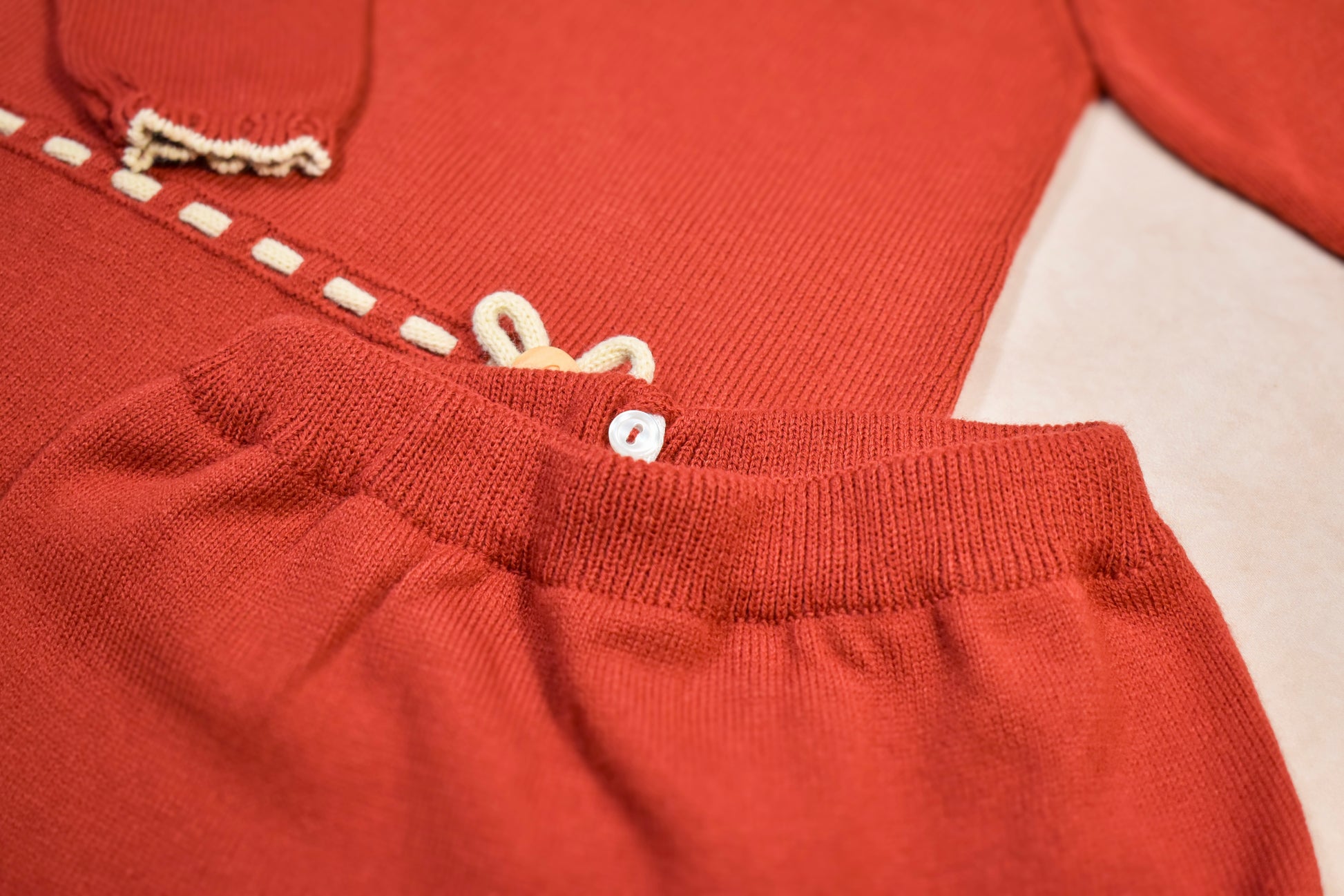 A soft little dream for cozy days and sweet outings. This two-piece knit set features a charming scalloped collar, delicate stitching details, and a tiny bow accent at the waist — those timeless touches we all love. The matching knit pants are designed with an adjustable waistband, offering comfort that grows with your little one.