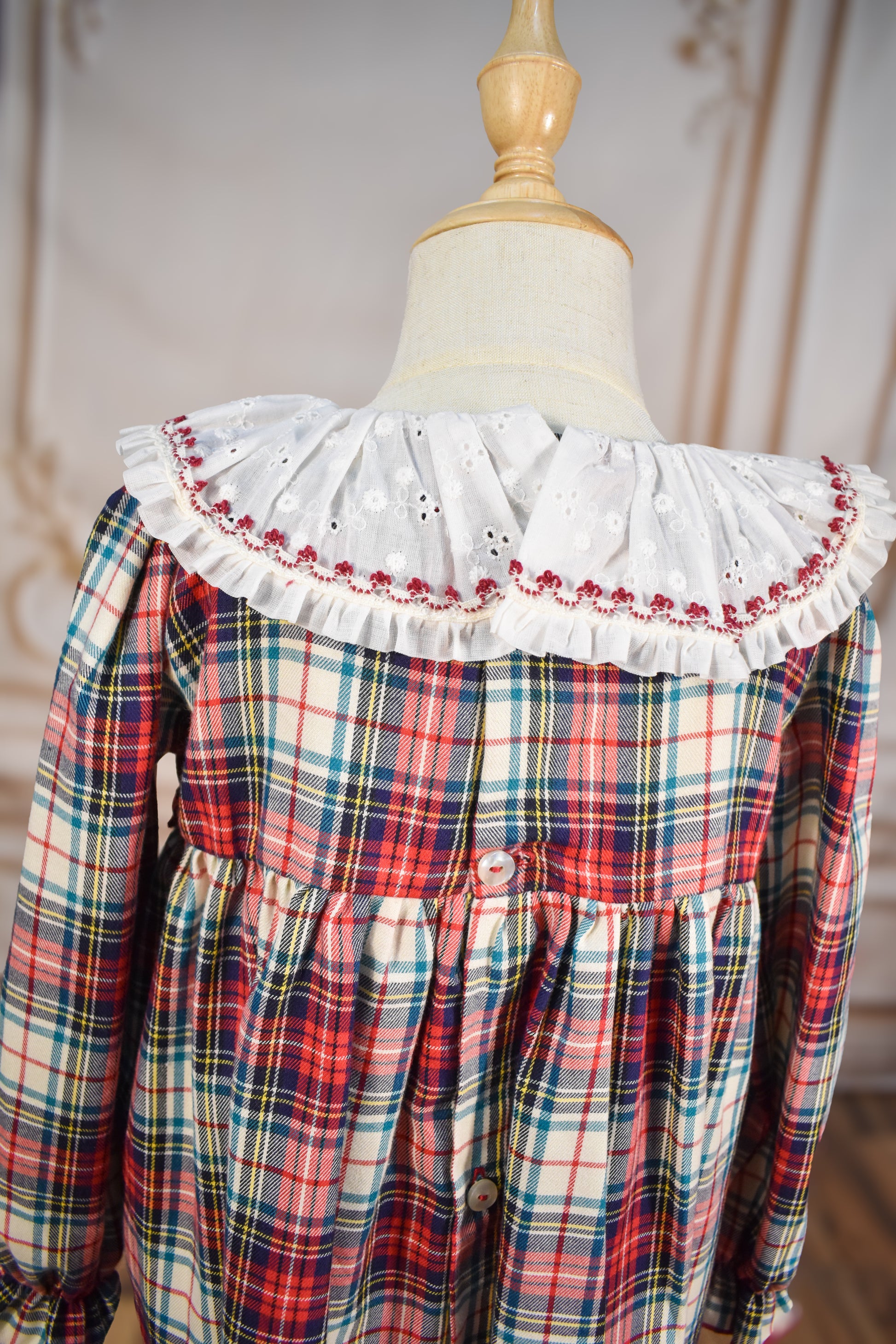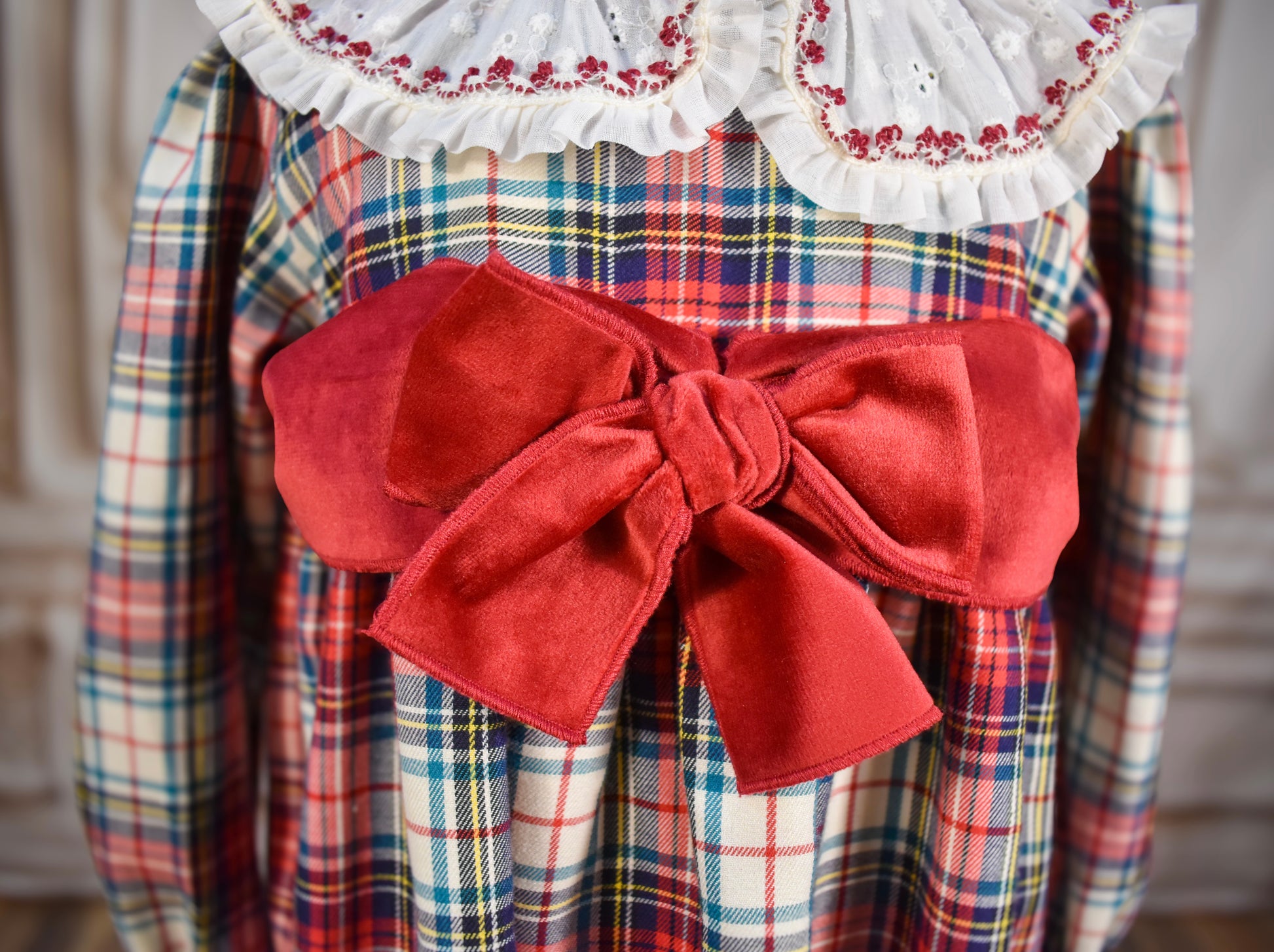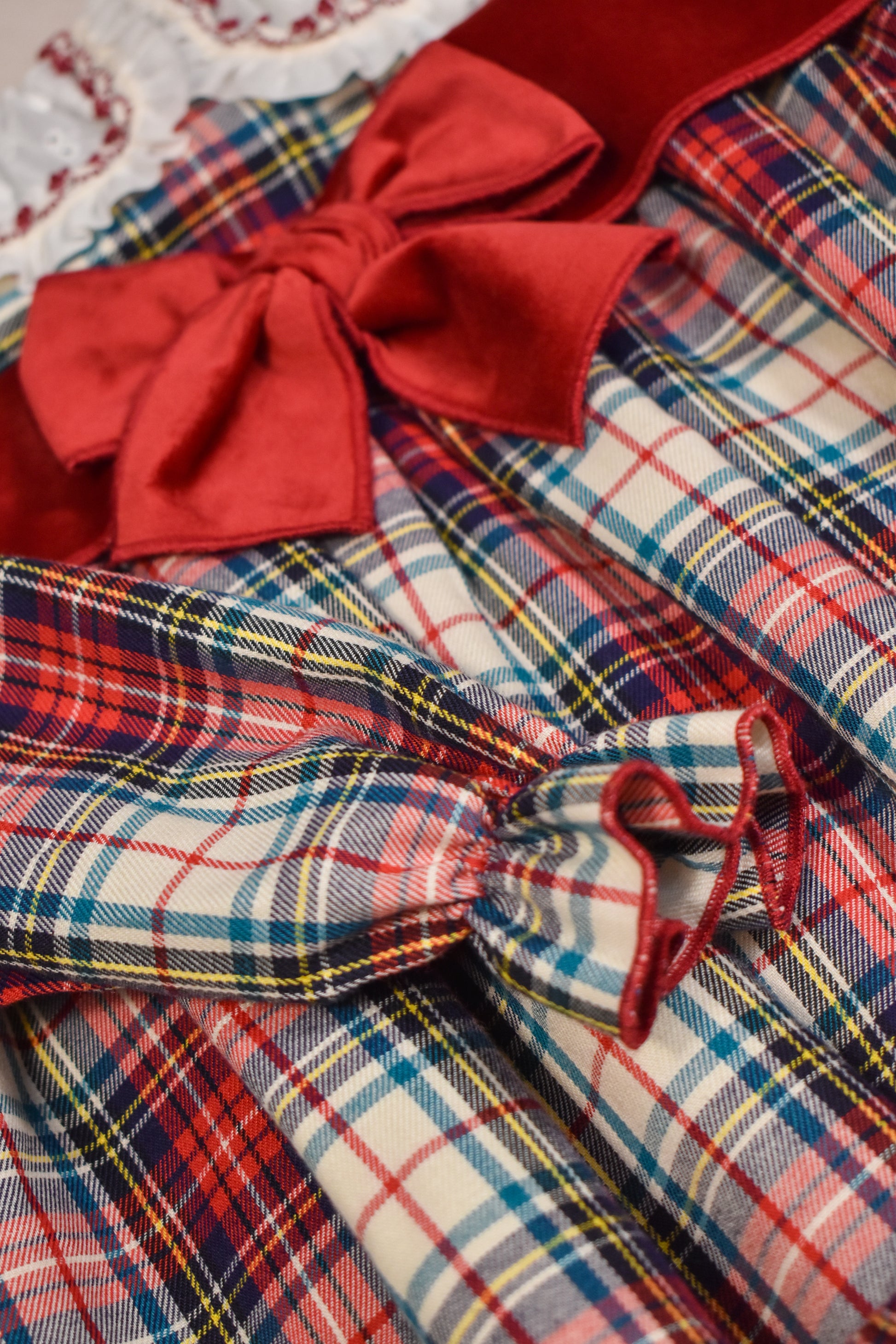 A plaid dress in a classic Royal Stewart-inspired tartan, featuring long puff sleeves, ruffled cuffs, and a beautifully detailed embroidered collar trimmed with cherry stitching. A statement velvet bow at the chest adds a touch of sophistication and festive cheer.