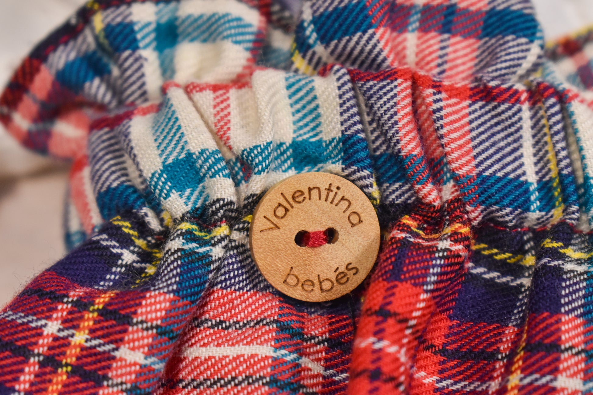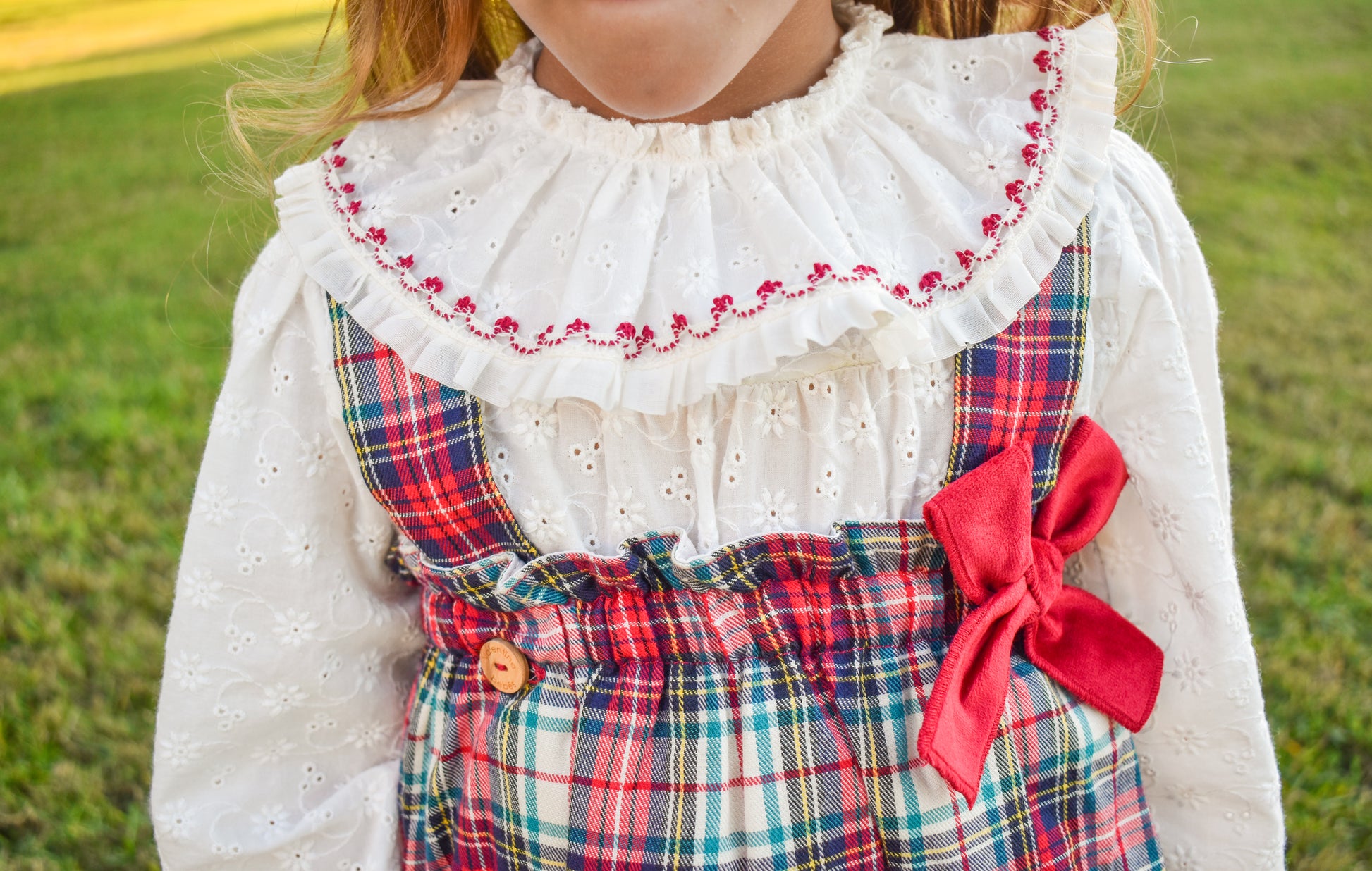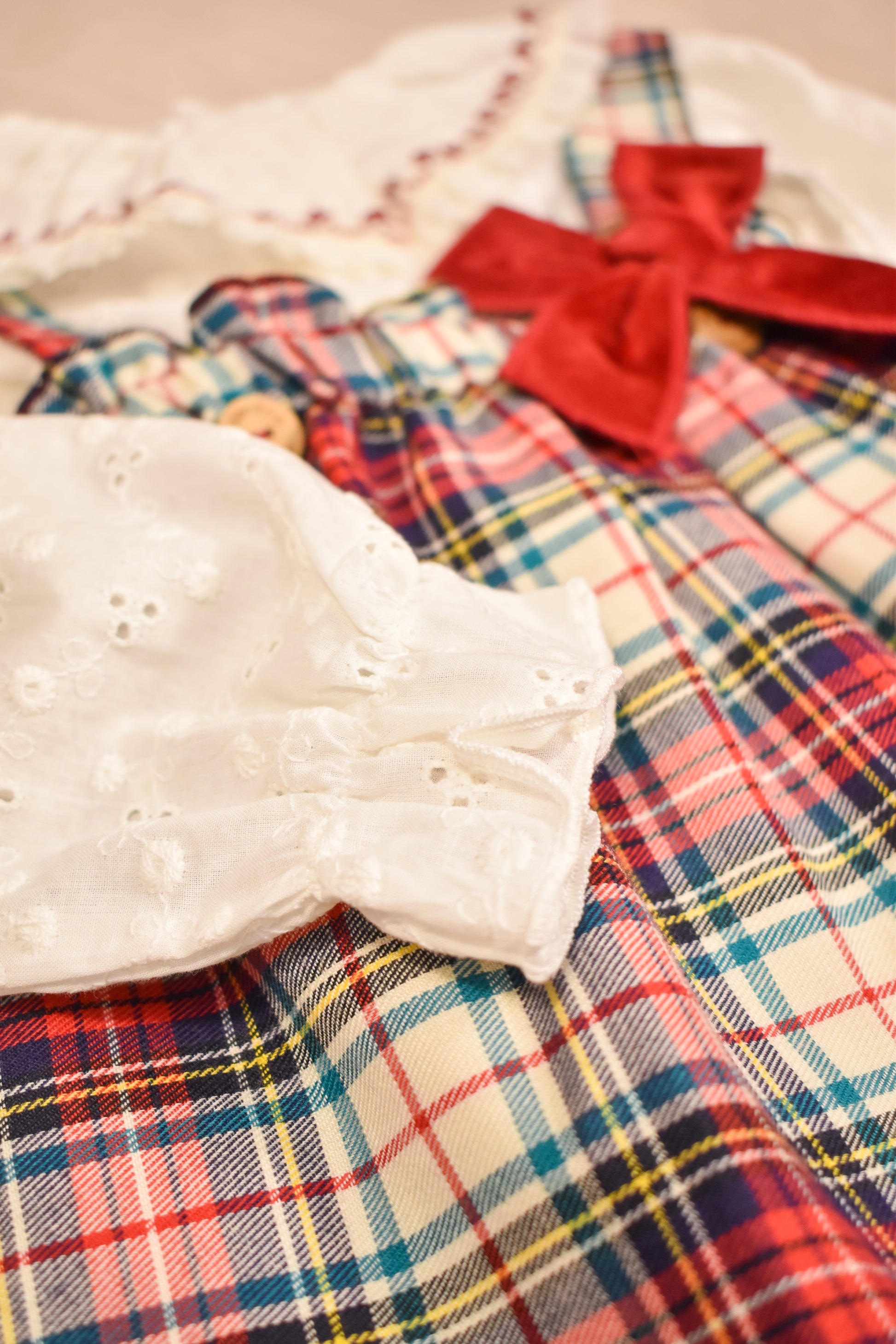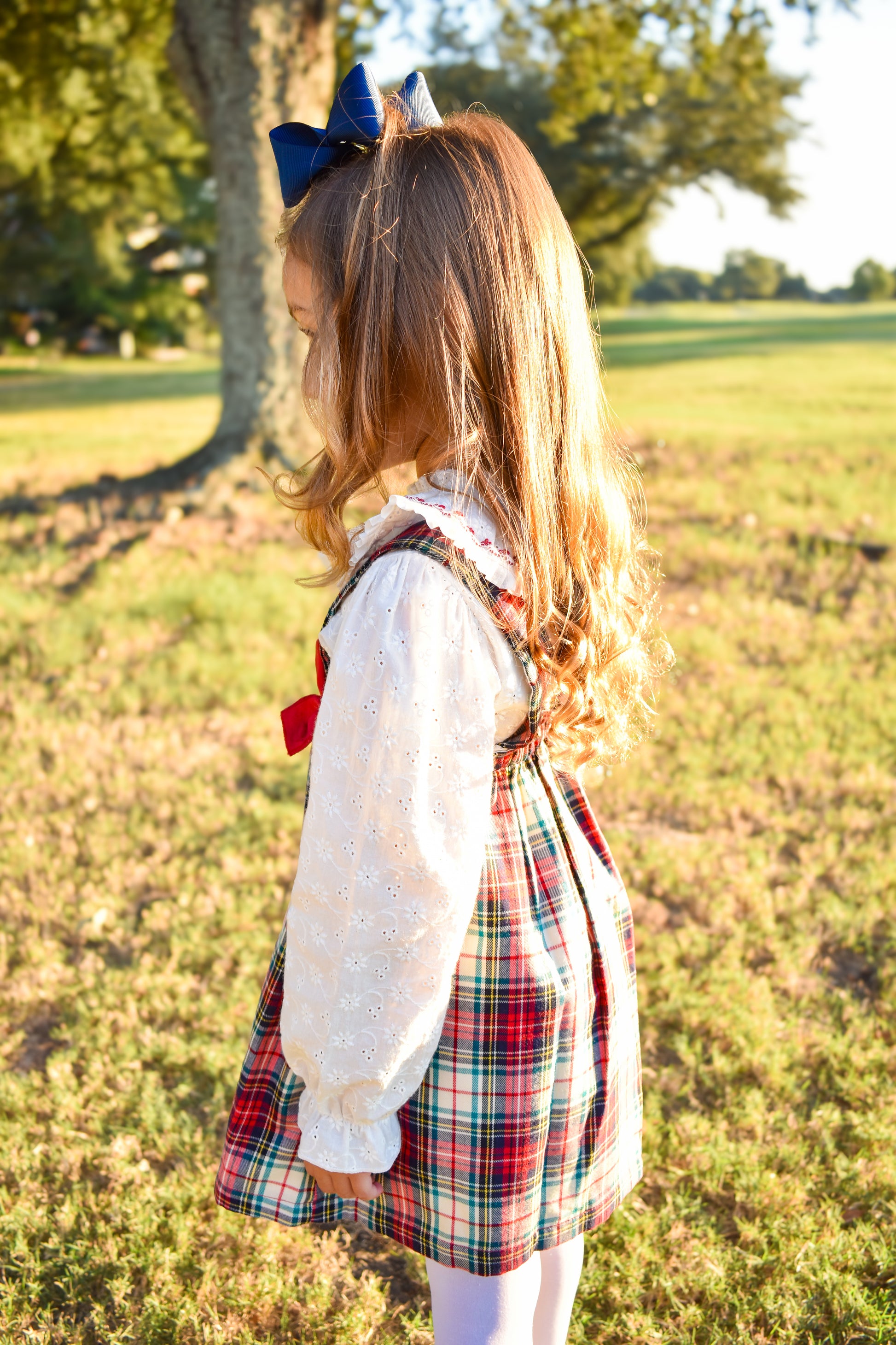 A plaid suspender skirt — crafted in soft holiday tartan with adjustable straps that can be worn straight or crossed in the back, and finished with a sweet side bow.