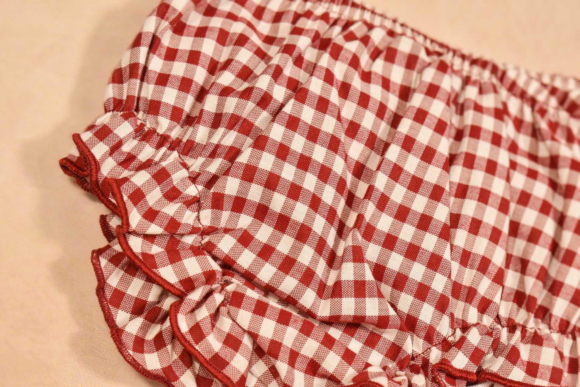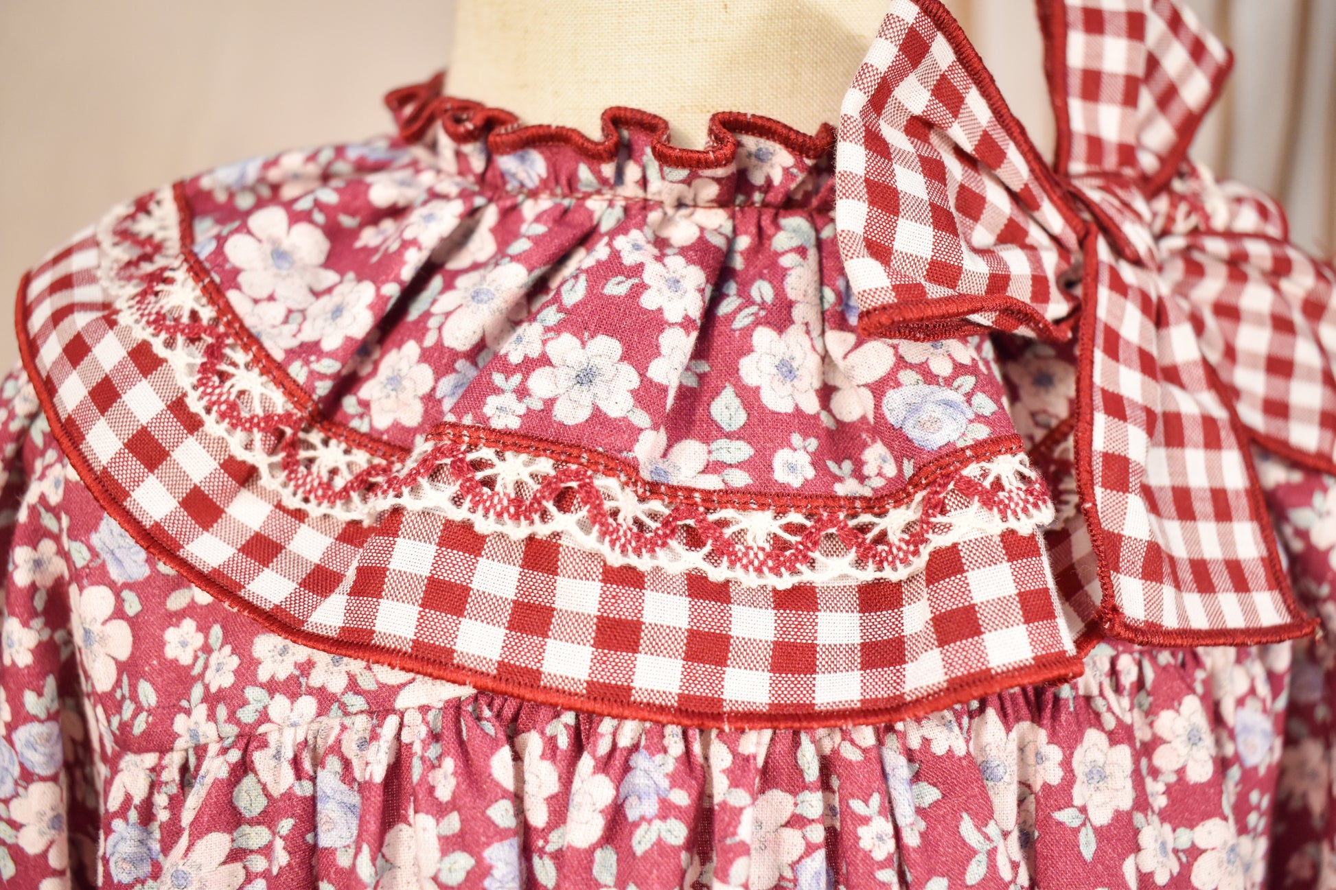 This two-piece dress set features a delicate burgundy floral print adorned with soft blue blossoms, trimmed with gingham accents along the collar and ruffles. The embroidered details on the neckline add a handcrafted touch, while the matching gingham bloomers complete the look with playful coordination.